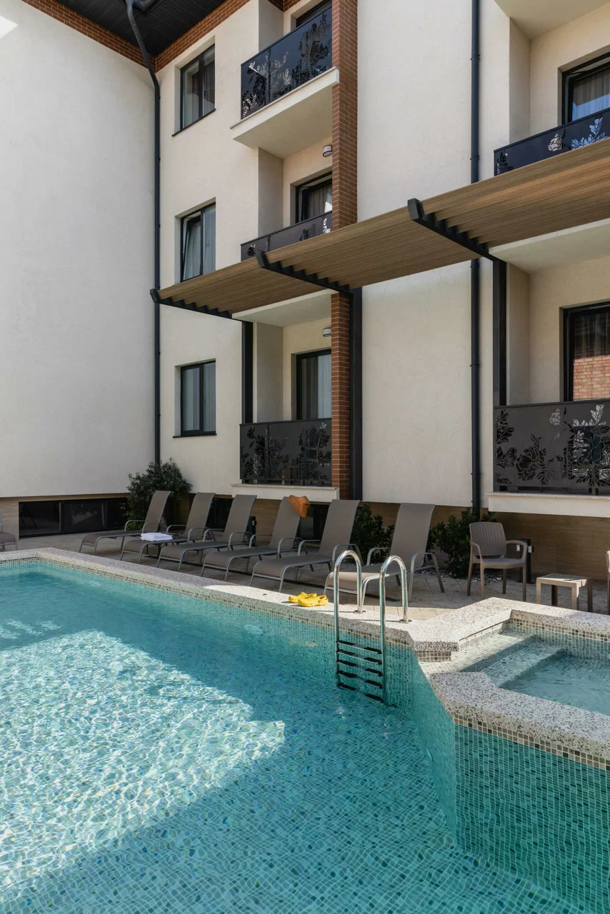 Комплекс представляет собой современное трёхэтажное здание, расположенное на закрытой территории среди малоэтажной застройки спокойного квартала. В отеле — 20 номеров с балконами и без, оформленных в мягких пастельных тонах.